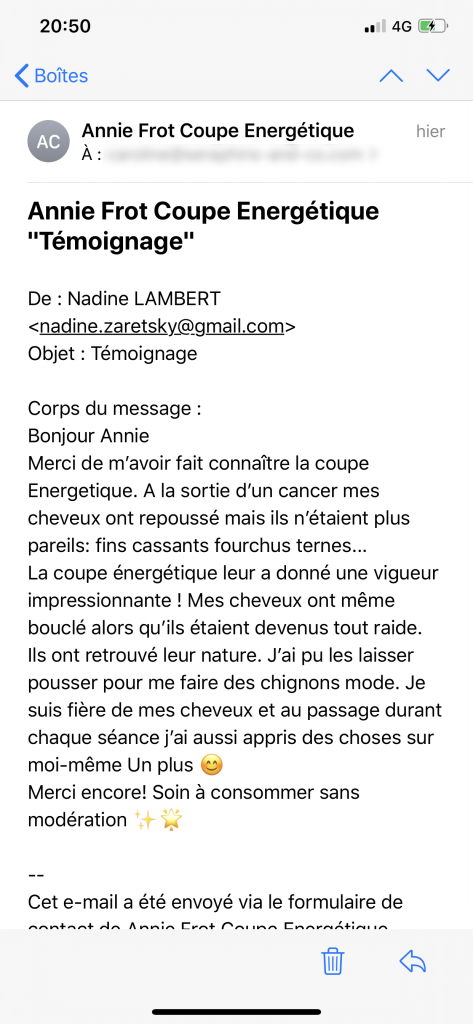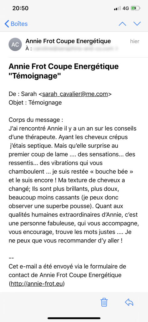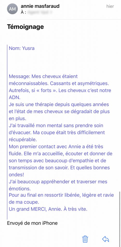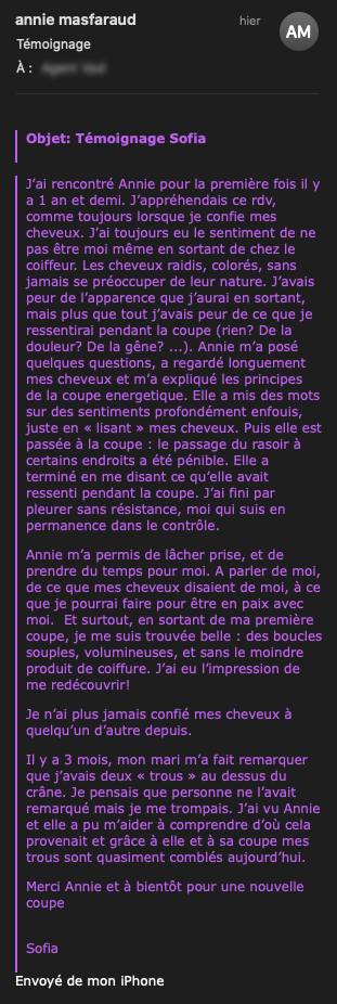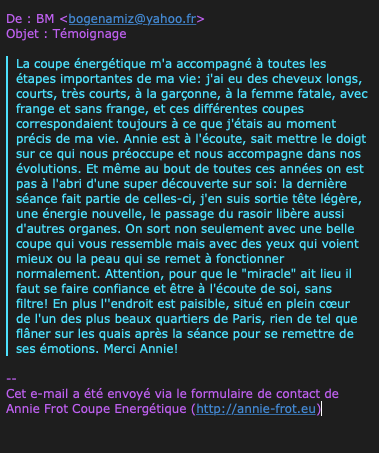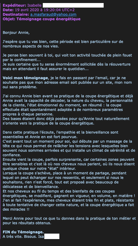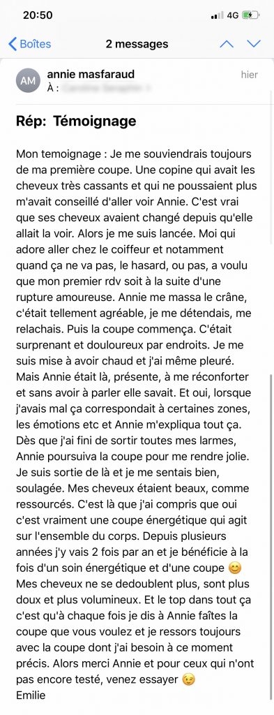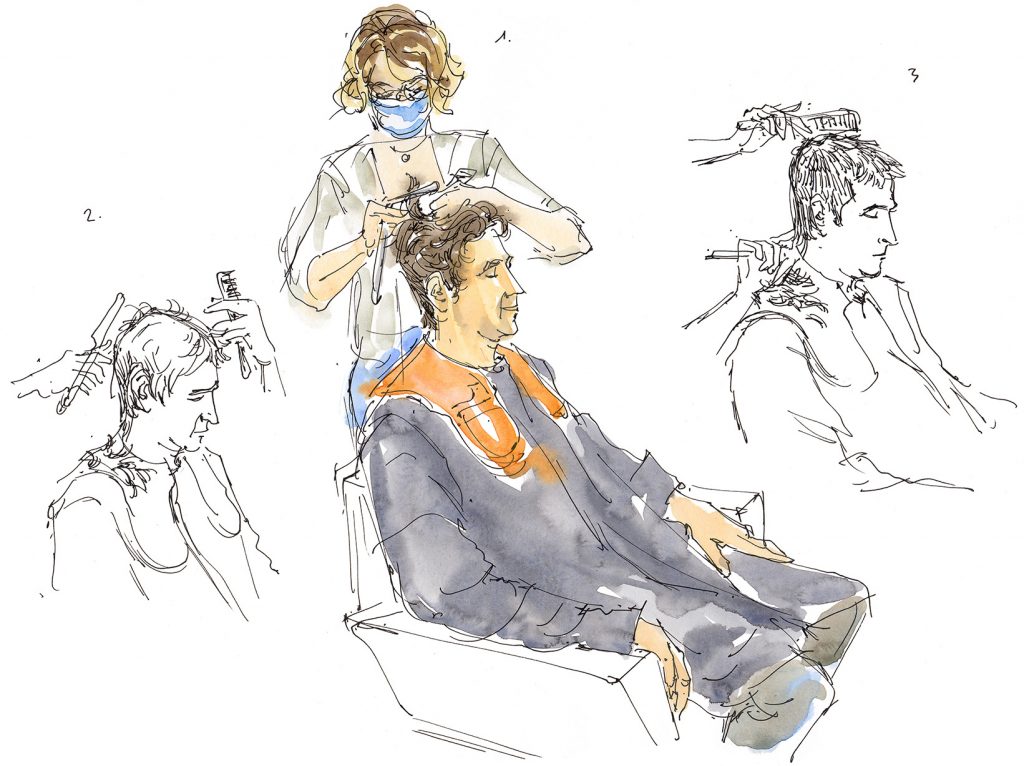 Derrière chacun à tour de rôle, Annie interprète leur mal-être. Ses mains auscultent le crâne, la coiffeuse repère les points sensibles et les faiblesses de chacun : le foie et la vésicule biliaire de Franck ont pâti ; Carole souffre d’oppression au poumon et d’une mauvaise circulation sanguine dans les jambes. Des effets secondaires de la sédentarité et du stress. La coupe au rasoir, insistant sur les points des méridiens concernés, va permettre de rééquilibrer les organes fragilisés. Le corps de la coiffeuse énergéticienne se fait réceptacle des maux et des nœuds internes de ses "patients". Annie aspire les énergies négatives qu’il lui faut évacuer entre chaque coupe. Elle se libère en secouant vivement ses bras et ses mains et rince son organisme en buvant à grands traits. Après ces deux longs mois d'inactivité forcée, Annie jubile de retrouver son salon , le lien intime et le soin libérateur avec ses habitués.